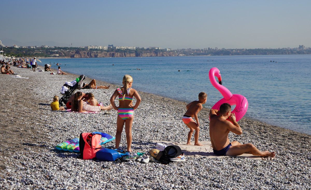 Sabah saatlerinden itibaren sahile gelen yerli ve yabancı turistler, güneşlenip Akdeniz’in ılık sularında yüzdü.